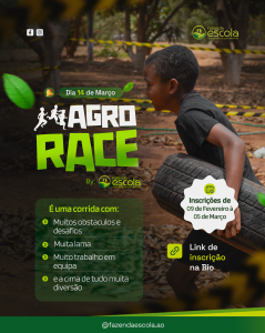 Teremos a Agro Race uma corrida de obstáculos cheia de adrenalina, gargalhadas e desafios pansados paraproporcionar ás crianças uma experiência memravel na Fazenda Escola.